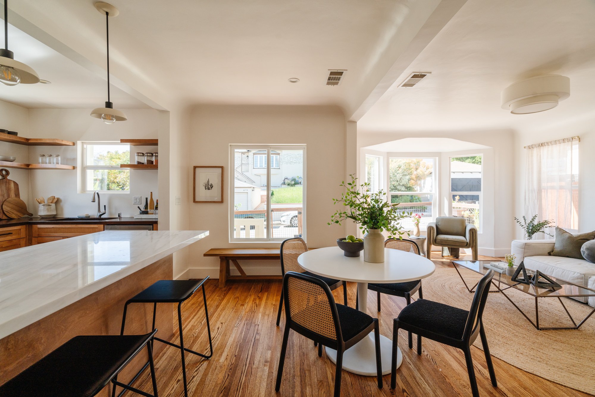 Graceful acacia and olive trees behind a field wire fence greet you as you enter the property; drought tolerant landscaping brimming with vibrant autumn sage and honeysuckle lead to a welcoming peach-hued front porch. The light and bright living room with original hardwood floors and charming bay window feels open and spacious. The kitchen features updated appliances, marble and butcher block countertops, and designer fixtures. A combination of open shelving and deep storage cabinets complete the functional design. Two large bedrooms overlook the verdant backyard. A full bath with tub completes the interior layout.
